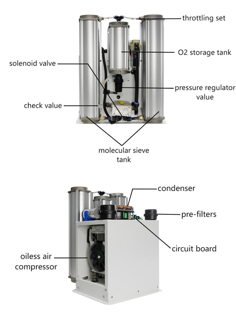 El aire tiene un 21 % de oxígeno y un 78 % de nitrógeno. Un concentrador de oxígeno separa el oxígeno del aire del nitrógeno mediante la tecnología de adsorción por cambio de presión (PSA). El tamiz molecular (zeolita) es un material inerte que adsorbe nitrógeno y vapor de agua bajo presión y deja pasar el oxígeno.