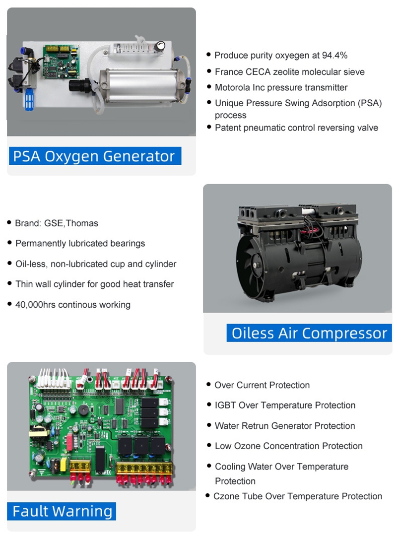 -Con condensador y secador de aire para eliminar el agua, lo que puede proteger la unidad de ozono para una larga vida útil en buenas condiciones de funcionamiento.