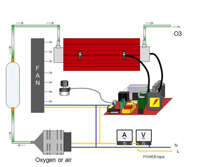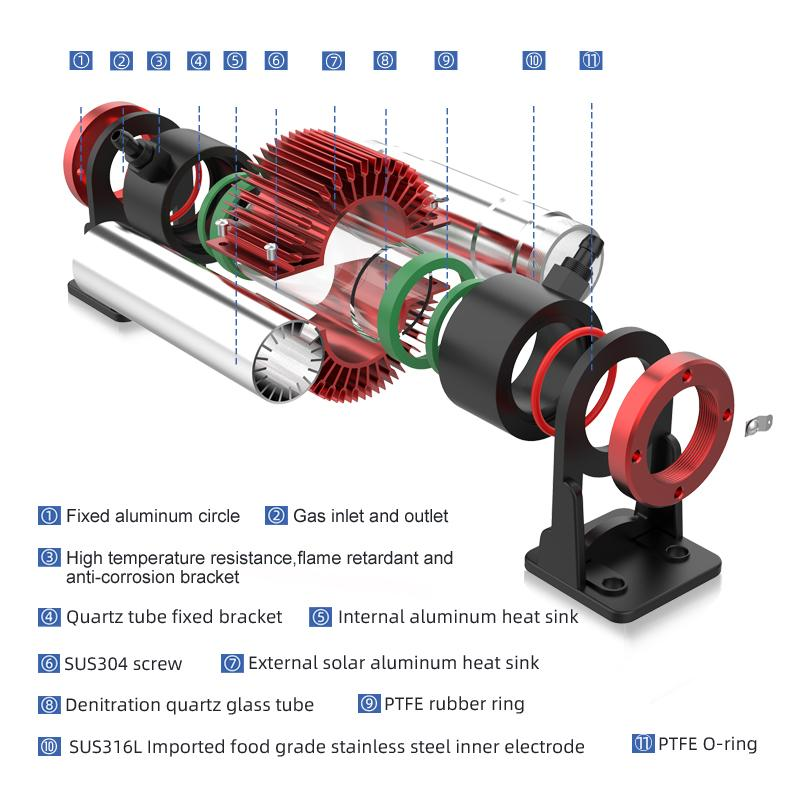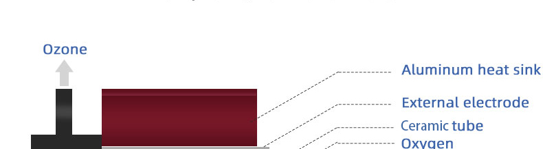Se introduce una fuente de oxígeno (ya sea aire ambiente u oxígeno concentrado) en el tubo. Se aplica energía eléctrica, creando una descarga de alto voltaje (como una descarga en corona) dentro del tubo. Esta energía eléctrica rompe las moléculas de oxígeno (O₂), permitiendo que los átomos de oxígeno individuales se recombinen en moléculas de ozono (O₃). El gas ozono generado está entonces listo para ser dirigido fuera del tubo para su aplicación. La pureza del oxígeno de entrada influye directamente en la concentración del ozono producido.